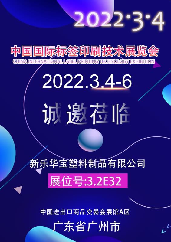 當(dāng)前位置:網(wǎng)站首頁 新聞動態(tài) 展會信息 新樂華寶塑料制品有限公司2022年3月4日到6日亮相中國國際標(biāo)簽印刷技術(shù)展覽會