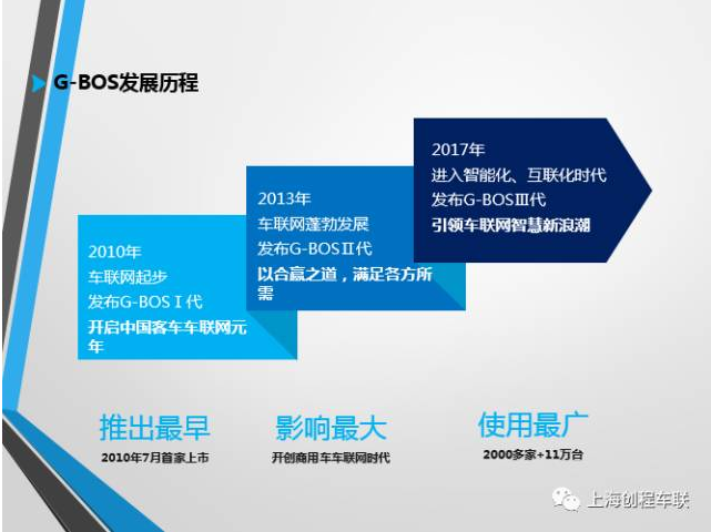 經(jīng)歷了公司成立之初的艱辛砥礪后,上海創(chuàng)程于2013年5月22日在北京上市發(fā)布G-BOS智慧運營系統(tǒng)II代,與其他類似產(chǎn)品一個顯著不同之處是實現(xiàn)了“三合規(guī)”:一是通過了公安部CCC檢測認證、交通運輸部部標(biāo)認證;二是GPS/北斗雙模終端率先通過交通運輸部部標(biāo)認證,成為客車行業(yè)首家;三是率先通過交通運輸部平臺符合性檢測,這也是客車行業(yè)首家。G-BOS智慧運營系統(tǒng)II代獨創(chuàng)性地提出了“帶機入網(wǎng)”的業(yè)務(wù)模式,啟動深藍計劃,與國內(nèi)各地的GPS運營商建立并展開廣泛合作,著力于解決G-BOS的落地接入問題,為G-BOS的商業(yè)運營奠定了堅實的基礎(chǔ)。